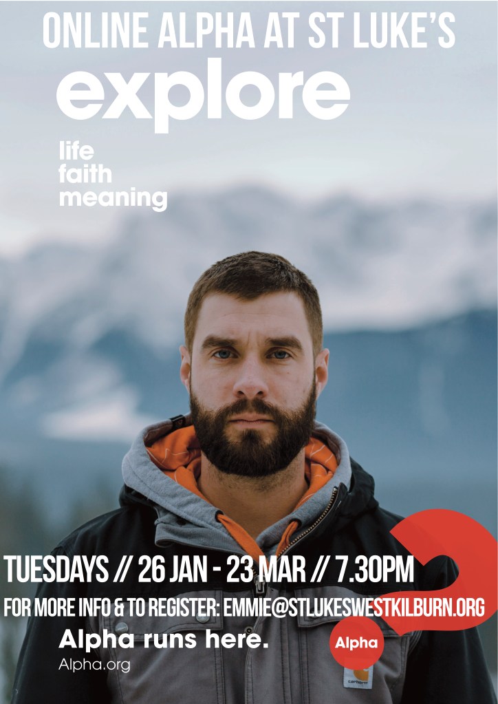 11/01/202111/01/2021stlukeskilburn Online Alpha at St Luke’s Alpha is an 8 week course which creates a space online for conversations about faith, life and God. For more information or to register for St Luke’s Online Alpha course starting on Tuesday 26 January at 7.30pm, email emmie@stlukeswestkilburn.org. Share this: Click to share on Facebook (Opens in new window) Facebook Click to share on X (Opens in new window) X Like Loading... Related